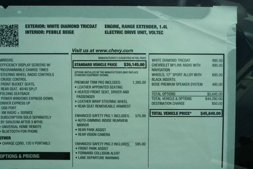 You are bidding on a new 2013 Chevy Volt. It is White Diamond Tricoat with Pebble Beige leather interior. It has 5 miles on it. It has an automatic transmission, Premium Trim Package, MyLink radio with Navigation, and Bose Premium speaker system. I have included all of the incentives in our price. This price does not include tax, doc, or plate fees. Please do not hesitate to call the dealership and ask for Rob with any questions. Or you can use the Ebay message system to ask questions as well. Please do not email me directly, only thru Ebay.