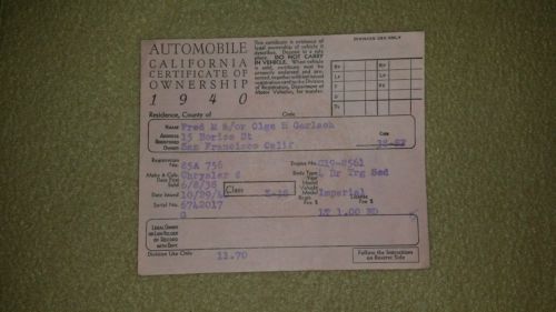 1938 IMPERIAL C-19 SEDAN--SIDE MOUNTED---STORED 57 YEARS IN CLOSED GARAGE--THIS CAR HAS ALWAYS BEEN PARKED INDOORS---IT IS AMAZING EVERYWHERE YOU LOOK---SOLD NEW AT McALLISTER CHRYSLER IN SAN FRANCISCO---ONE FAMILY SINCE NEW---ALMOST EVERY MILE IT WAS DRIVEN AND EVERY GALLON OF GAS IT USED IS DOCUMENTED IN LOGS---ALL THE STATES ON ALL THE TRIPS THEY TOOK---CABINS THEY STAYED IN---BROCHURE THEY BOUGHT IT WITH--SALES MANS NAME PRINTED INSIDE COVER---ORIGINAL LICENCE FRAMES FROM DEALER-----GARAGED ITS WHOLE LIFE-------ALL NEW BRAKES AND HOSES--- GET IN AND GO DRIVER---OVERDRIVE-----SIDE GLASS REPLACED----DETAILED----- 408 892 5959
