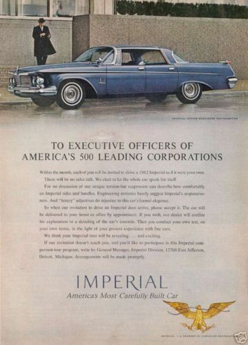 "America's most carefully built car" - that was the ad copy for the 1962 Imperial. It was not just hype, the car was the pinnacle of American quality and design. Featuring a 413 CID V-8, the Imperial produced 340 hp and 470 ft pounds of torque. Despite its massive 4800 pounds, it still could turn in a respectable 0-60 time of 9.4 seconds and top out at 120 mph. Tom McCahill wrote " . . . the '62 Imperial is the best sedan made in the world today . . .".