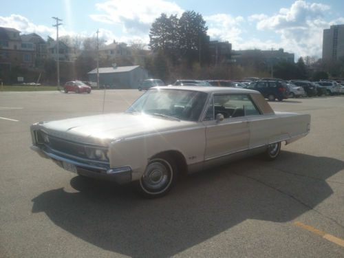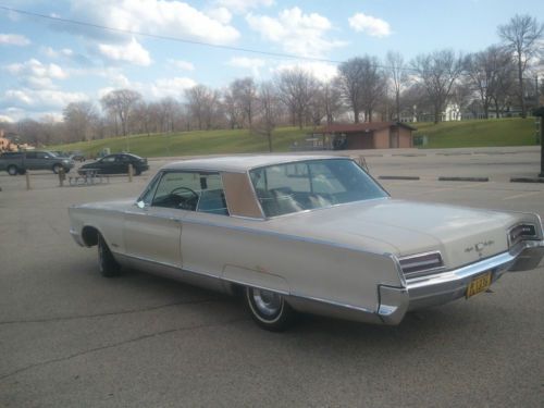 Sold new in Los Angles, and was there until 2002 when it was bought to Wisconsin as a summer vehicle by a local collector. He summered the car until 2010 when the reverse band broke in the transmission and he put the car into storage. I bought the car from him in 2012 and put it in my garage and began working on it. Life got in the way and I didn't work on it as much I had planned. There it sat until a few months ago when I focused on it and got it back on the road. So long story short, it spent most of it's life in Cali, and came to Wisconsin and was cared for. It's never been driven in winter and subject to road salt. It wasn't sitting in someones yard or field rotting away. It still has the factory brake lines on it, and they are perfect. The brake line fittings came off with open ended wrenches. Ivory paint with black leather, bucket seats with fold down arm rest, power drivers seat, power windows, Air Conditioning, tinted glass, dual exhaust, power drum brakes, AM radio, 350 horsepower 440 cubic inch motor, 4 barrel carb, 727 Torqueflight automatic trans, 14 inch wheels with new tires Solid California car. Still has most of the factory under coating still on it. Solid floors. Solid trunk. Solid rockers. Solid doors. One small rust hole behind one of the fender skirts, another small hole on the inside behind the rear wheel well. They don't get much more solid than this. The pictures show it missing two pieces of trim, I have those two pieces. Was told by the previous owner that he had the heads redone and hardened valve seats installed. I have done the following repairs: Rebuilt the transmission, New front and rear brakes (New drums, shoes, hardware, wheel cylinders, hoses, adjusters) New front and rear shocks New front wheel bearings New rear axle bearings New axle housing end (bearing failed and wrecked the housing end) New upper ball joints, control arm bushings, bump stops New inner and outer tie rod ends, idler arm, pitman arm New wheel studs on the left side of the car (all wheel studs are now right hand thread) New lower ball joints and lower bump stops New motor mounts New dipstick and tube New master cylinder (replaced the original single piston MC with a 1967 Chrysler dual piston MC) New spark plugs, wires, cap and rotor New battery Had it aligned after I did all the front end work New R134a compatible AC Compressor, new receiver/drier, car was missing a couple lines when I got it and I am having those made now, as soon as I get them the system, will be hooked up and charged with freon. A lot of extra parts including a bunch of NOS Chrysler parts included. New custom door panels Drivers seat recovered and re-padded Rear seat bottom recovered and re-padded. Passenger rear window doesn't work, it needs a motor. Headliner is perfect Dash pad is perfect Mechanically it is 9.5/10 Interior is 9/10 Body is 8.5/10 Paint is 7/10 A great car with tons of potential to be a stunning car; or rock it as it is. it's not the project that so many old cars turn into. I've done all that. It's all there. You can get in it and start enjoying it right away. I have too many toys and not enough space. I am driving the car so the mileage will go up. I spent all day yesterday washing it and waxing it. It shined up real nice! I also cleaned up the dash and vacuumed the carpets. I will get some new pictures and post them tomorrow when it stops raining. |