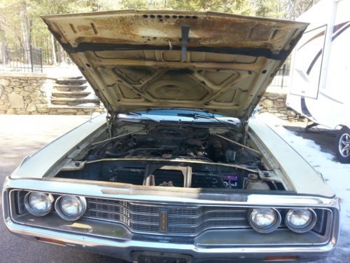 This is a very nice 1969 Chrysler New Yorker - 4 Door - L code car with Original HP440 (375 HP engine) Y3 yellow exterior & F5 green interior. The engine was rebuilt about 15,000 miles ago and I have the detailed receipt of what was done. I fully believe this car is still wearing its original paint and still has its original interior in it in very nice condition. I'm not an expert on survivor cars so I encourage you to come and inspect it yourself or ask me for any additional pictures you may need to confirm that fact. The car is loaded. Power seats, cruise control, power windows and electric door locks, etc... The car was originally from California and has no rot from what I can see. There is some light surface rust starting here and there but nothing major at all. It starts right up and runs and drives very well. The brakes work well and the transmission shifts very well. This car is very road worthy and was on the road when I bought it recently and still has a current Mass inspection sticker and I have a Mass title for it.
