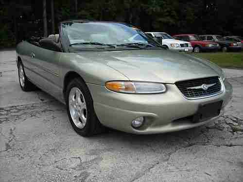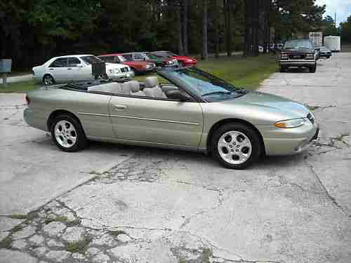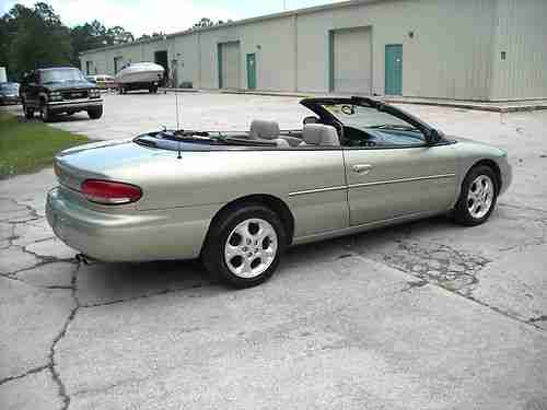 Another great Deal from German Motors Inc. Jacksonville,Florida,32073, 904-631-1055 ,tired of looking at worn out,down the Hill Convertibles only why you want to spend less then $ 5,000.00 . Let me tell what I have here for you,selling with absolute NO RESERVE (check my Feedback and Sales),to the highest Bidder this beautyful Sebring Convertible with only 85.080 Miles on it.Fantastic Paint job (this is the color it shows different depending how the Sun shines on it,it something between silver/gold with a touch of emerald.) ,like new Full Leather Interior ,loaded with everything,Powerseat,Cruise,Tilt,cold Air,Infinity Stereo CD and Infinity Speakers ,all Power Windows,Power Doorlocks with Remote and Alarm.Also the Powertop is all there and like new.Included is also the hard to find Boot Cover,all Books,both Keys.all there.Just had Service done incl.4 new Tires,Brake check etc.Never smoked in, always garaged , All it needs is you as a Driver.Selling with NO RESERVE,no Bull,no Last minute take off.I say...NO RESERVE..thats what it is !! We Export Worldwide or have it delivered right to your front Door here in the USA. NO DEALER FEE'S !!!,what you bid is what you Pay,only Florida Buyers have to ad Tax and Title Fee's.Inspections welcome Mo-Fr 9-5.Call or email me Thomas 904-631-1055 for any Question you might have.That's it..Now Bid and win that Auction !!