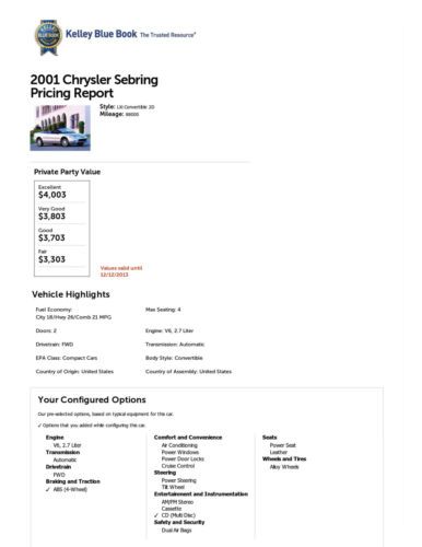 This vehicle is in excellent condition with only minimal wear and tear. Exterior is in excellent original condition and has never been in any accidents. Interior is super clean with no tears or stains to leather or carpet. All the electronics work on this vehicle. All windows roll up and down and the convertible top works flawlessly. A/C blows ice cold and it also comes equipped with a CD Changer. Tires are at about 50-60% and only one center cap is missing from the aluminum wheels. Mechanically this car is in excellent condition as the engine has recently been rebuilt with brand new timing chain kit along with oil pump, water pump, and many other items. All the fluids were all replaced along with spark plugs and filters. It passed CA Smog Check on 12/02/2013 and I will provide the new owner with the certificate. This is a CLEAN CA TITLE vehicle and registration is current until JULY 2014. This car is really fun to drive and gets 28 mpg on the highway and 22-24 on the combined. KBB value of vehicle in this condition is for $4000 . If you have any questions or to schedule a test drive please call 619-201-1385.