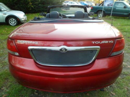 THIS IS THE TIME OF YEAR TO BUY A CONVERTIBLE, WHEN ITS OUT OF SEASON. THIS 04 SEBRING RUNS EXCELLENT, I WOULD DRIVE ANYWHERE WITHOUT A SECOND THOUGHT IT RUNS THAT GOOD & HAS ICE COLD AIR CONDITIONING & A 2.7 LITER 6 CYLINDER ENGINE.TOP HAS A SMALL TEAR, (ONE ON THE EDGE,(WAS REPAIRED BUT COULD PATCH AND WOULD'NT HAVE A PROBLEM.) PASSED INSPECTION, ONE OF THE SEATS NEED REPAIR, SIMPLE FIX JUST CANT GO BACK, THE INTERIOR IN GOOD SHAPE,THE CAR RUNS EXCELLENT WITH NO WARNING LIGHTS ON DASH.HAS ICE COLD AIR CONDITIONING & A AM/FM CD PLAYER.THE FRAME IS IN GREAT SHAPE,AFTER A TEST DRIVE WE FOUND THAT THE 2.7 LITER 6 CYLINDER DUAL OVERHEAD CAM 24 VALVE ENGINE RUNS FANTASTIC & THE AUTOMATIC TRANSMISSION SHIFTS VERY SMOOTH.IF YOU ARE LOOKING FOR A DEPENDABLE CAR @ A EXCELLENT PRICE BUY THIS SEBRING CONVERTIBLE. THE BODY IN GOOD SHAPE JUST YOUR NORMAL SCRATCHES, PAINT CHIPS ON BUMPERS & SMALL CREASES IN HOOD.IF YOU DRIVE IT YOU WILL BUY IT. |