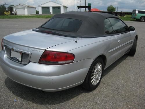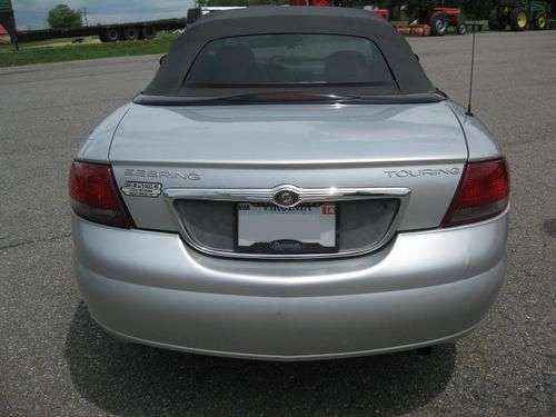 2004 Chrysler Sebring Touring in good condition, runs great, clean on interior and exterior. Has 154,468 miles on a 2.7L V6 Eng. Features cruise control, power windows and locks, dual airbags, air conditioning, Sony CD player and new Goodyear tires. Dynamat sound deepening tape was installed in trunk where a 15" was installed to dampen rattling (15" not included :). Top is in good shape.