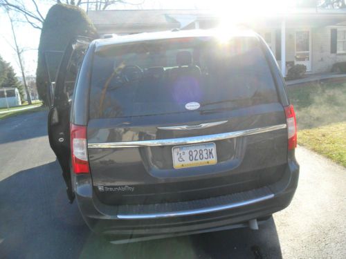 2011 Chrysler Town & Country Touring Minivan (Handicap Equipped), Dark Charcoal, 4door, Mileage: 7,500, V6, 3.6 liter engine, automatic, 6 speed w/overdrive and autostick, front wheel drive, traction control, stability control, ABS (4 wheel), parking sensors, back up camera, power steering, cruise control, power driver seat, power driver sliding door, power rear lift hatch/lift gate, dual power sliding door, power door locks, power windows & power 1/4 vents, 2nd row power windows, power mirrors (heated), keyless entry, air conditioning (front & rear), 3 passenger split rear bench seat, rear window defroster/washer/wiper, dark tinted glass, illuminated vanity mirror, steering wheel radio controls, cloth interior, quad seating, dual airbags side airbags, F&R head curtain airbags, aluminum wheels, AM/FM stereo, MP3, Sirius equipped, DVD system, roof rack. In addition, the van was outfitted in November of 2011 with the Braun Entervan II Conversion by M.I.T.S. Corporation of Glen Rock, Pa. at a cost of $24, 425. In 2013, the van was enhanced further by Total Mobility Services of Harrisburg, Pa. to build up the interior floor by 2-3inches with non-skid covering, an E-Z lock electric wheelchair tie-down system, and floor mounted pedal extensions of 6” to 12” at a cost of $10, 305. The pedal extensions have been removed, but are available for little people who may be interested in the van. Likewise, the captain’s chair has been reinstalled into tie-down system for driving by full sized adults, but is removable for little people. There is a small dent next to the passenger door handle, and some scratching of the paint at the front of the hood on both sides as well as some scratching to the front bumper coating. See picture of dent and picture of scratching (typical). The vehicle otherwise is in excellent shape. |