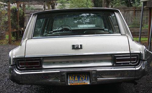 1966 CHRYSLER TOWN AND COUNTRY WAGON, 100% ORIGINAL CAR, BOUGHT NEW IN UPSCALE COMMUNITY OF LAKE OSWEGO, OREGON.I AM THE SECOND OWNER. RECENTLY PULLED FROM STORAGE WHERE IT HAS BEEN KEPT IN IT'S "TIME CAPSULE" SINCE 1988. CAR HAS NOT BEEN STARTED.NEEDS BATTERY CABLES, TANK DRAINED ETC. 500 MILES PRIOR TO IT'S STORAGE THE CAR WAS FULLY SERVICED.SERVICE STICKER INDICATED EVERYTHING WAS OK. THIS 100% ORIGINAL CAR HAS BEEN UNMOLESTED AND UNALTERED. IT IS 100% COMPLETE EXCEPT FOR THE REAR-RIGHT SIDE GLASS HAD BEEN BROKEN AND HAS NOT BEEN REPLACE(EASY AND CHEAP TO GET FLAT GLASS). BOTH SIDE MIRRORS HAVE CRACKED GLASS BUT THE CAR COMES WITH ONE REPLACEMENT MIRROR.THE CAR IS VERY SOLID AND ANY RUST IN PICTURES IS VERY LIGHT SURFACE RUST. THIS RUST APPEARED SHORTLY AFTER IT WAS TAKEN OUT OF STORAGE DUE TO CLIMATE CHANGE. THE INTERIOR IS IN EXCELLENT CONDITION INCLUDING SEATS, HEADLINER, DASH, CARPET IS STAINED HERE AND THERE BUT NOT WORN. BACK COMPARTMENT CARPET IS IN EXCELLENT CONDITION AND NOT STAINED. STAINLESS TRIM IS COMPLETE AND IN GREAT SHAPE.RARE FACTORY AIR. SIMPLY PUT THIS CAR IS THE ULTIMATE RESTORATION CANDIDATE OR LEAVE AS IS.