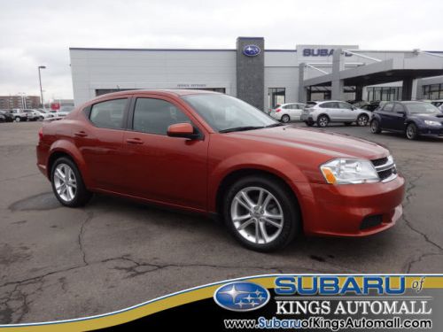 Subaru Stellar Care Award Recipient for outstanding customer service and satisfaction.Subaru of Kings Automall proudly presents this carfax 1 owner 2012 Dodge AVENGER 4dr Sdn SXT. Represented in ORANGE and complimented nicely by its BLACK interior. Fuel Efficiency comes in at 31 highway and 20 city. Under the hood you will find the 2.4 coupled with the AUTOMATIC. The Word Around Town: For a mid-sized sedan, the Avenger stands out in two ways: aggressive, sporty styling, which is borrowed from the Dodge Charger, and its fuel economy, which can manage as high as 30 mpg on the highway. The Avenger's new, redesigned interior features nicer materials and is quieter than in years past, and its upgraded styling and quality makes it a viable alternative in a crowded small car market. The R/T Avenger appeals to driving enthusiasts, and includes sporty suspension, leather interior and special exterior styling. Options and Safety Features: Nicely equipped with Active head restraints, Child seat anchor system, LATCH ready, Child seat upper tether anchors, Dual-note horn, Electronic stability program, Front advanced multi-stage airbags -inc: front passenger occupant sensor, Front height adjustable shoulder belts, Inside trunk emergency release, Rear center 3-point seat belt, Rear door child protection locks, Supplemental front & rear side-curtain airbags, Supplemental front seat side airbags, Supplemental side airbags, Tire pressure monitoring display, Traction control and 12 VOLT POWER SOURCE, AIR CONDITIONING, ALLOY WHEELS, AM/FM STEREO RADIO, ANTI-LOCK BRAKING SYSTEM (ABS), AUTO EXPRESS DOWN WINDOW, CENTER ARM REST, CENTER CONSOLE, CLOCK, COMPACT DISC PLAYER, COMPASS, CRUISE CONTROL, DAY/NIGHT LEVER, DUAL AIR BAGS, GAUGE CLUSTER, HEATED OUTSIDE MIRROR(S), INTERMITTENT WIPERS, MAP LIGHTS, OUTSIDE TEMPERATURE GAUGE, POWER DOOR LOCKS, POWER MIRRORS, POWER STEERING, POWER SUNROOF, POWER WINDOWS, RADIAL TIRES, REAR WINDOW DEFROSTER, RECLINING SEATS, SIDE AIR BAG SYSTEM, BEFORE YOU COME TO THE LOT TO LOOK AT A PARTICULAR VEHICLE, GIVE JEREMY VASKE A CALL @ 888-210-8460. THIS WILL ENSURE THAT THE VEHICLE IS HERE ON THE LOT AND READY TO SELL. WE ALWAYS TRY TO ENSURE THAT ALL INFORMATION ON THE VEHICLE ARE ACCURATE. PLEASE ASK TO SEE THE CARFAX ON THE VEHICLE THAT YOU ARE INTERESTED IN. THANK YOU FOR VISITING OUR VEHICLES AND HAVE A GREAT DAY.