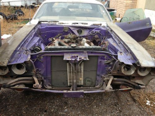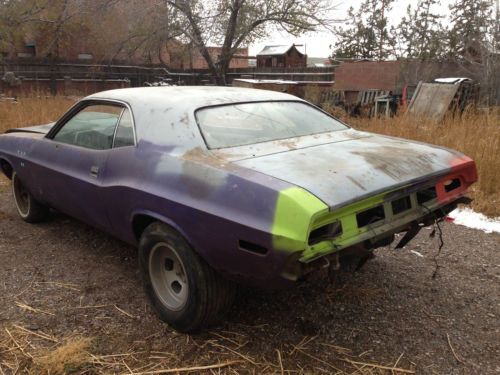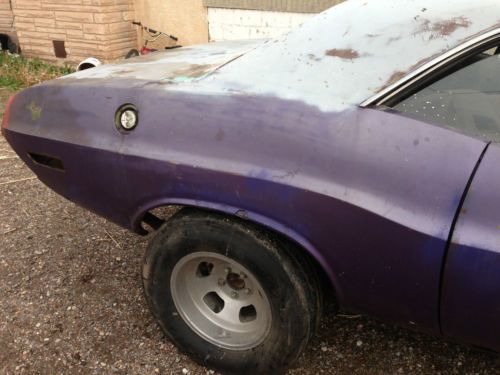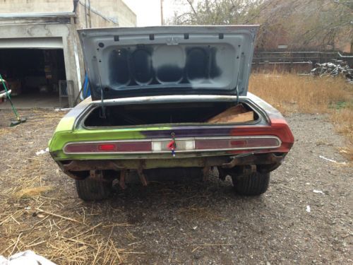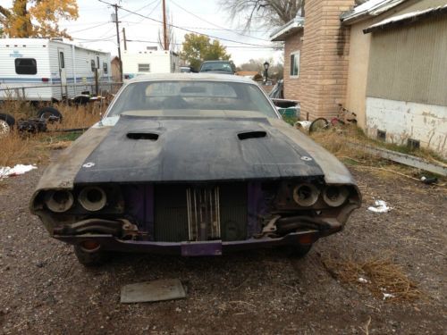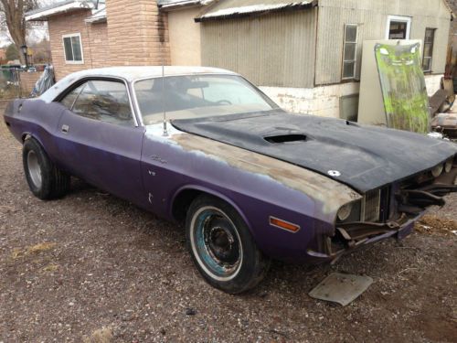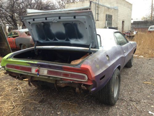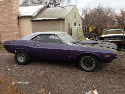 1970 Dodge Challenger complete running project Barn find. Car is all complete with all windows and trim. Has some rust around wheel wells and lower qtrs, 1 spot on passenger rocker panel, rust in lower dog legs of fenders would replace passenger fender, door jambs are perfect same as firewall and cowl, roof also in great shape and around windows, new trunk pan, new floor pans, rails look good all in all a great looking complete car also has all bumpers. Has good running 440 with auto trans has posi rear end 8 3/4 clear title matching vintag and all body #'s. Will come with good roller wheels rears do not go with. Car has been described to the best of my knowledge and is sold as is with no warranty. If you have any ?'s feel free to give me at call 505-238-8532. 71 Barracuda shell also for sale in back ground. Thanks and good luck.