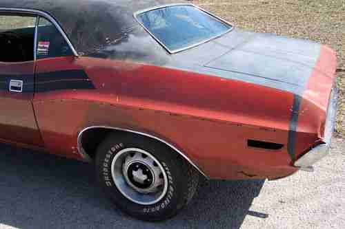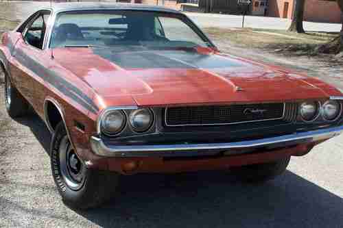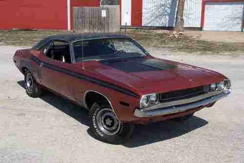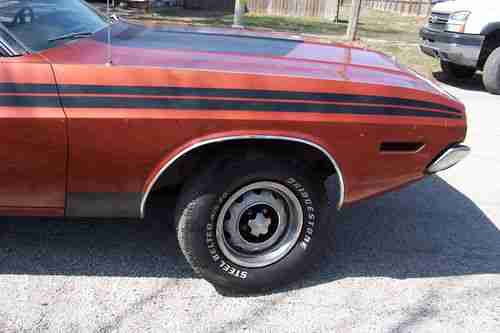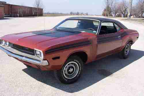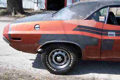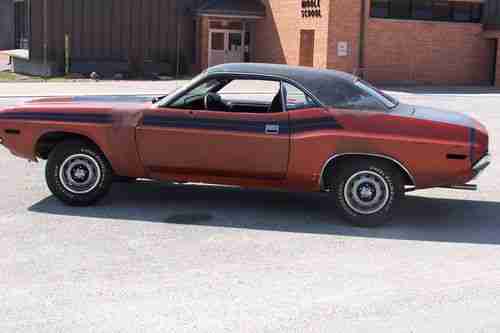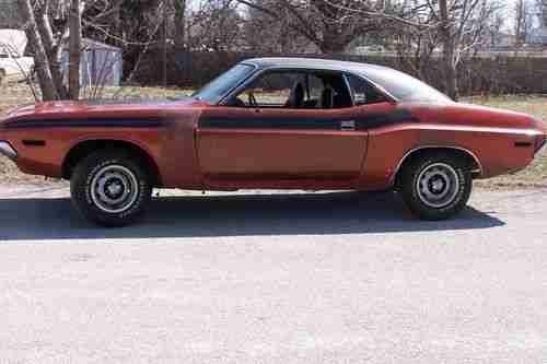 This is a 1970 dodge challenger project .The vin matches the body, radiater support and the fender tag all match title.The car would make a good driver, has exhaust on it all guages and dash and steering seem to be ok,all glass is good. Brakes are no good, but e-brake works. the car has no engine or trans. It is a fairly complete body ( what you see in pics is whats there). This is alot more complete than alot of projects. It has typical rust in several areas but is also solid in several ways. It has rust in both lower quarters the lower front fenders. the rear glass has rust around it also. The doors are solid , the rockers are also solid. The front aprons are solid and the cowl and front frame rails are good. the drivers rear rail will need replaced. The passenger one has a small spot on it. The grill is nice, the trunk floor has rusted areas so it will need replaced. As i said it has alot of good areas but also rust in several areas. The front drivers fender has damage (see pic) the rest of the front wrap is straight. Wheels and tires dont go (will provide rolers)