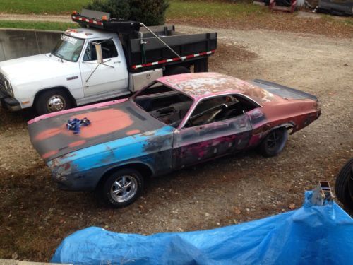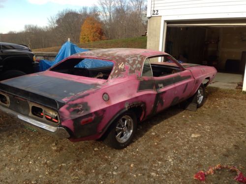 1973 dodge challenger project car. Bought last year as a project but lost interest and time. Reason I chose this car is because it's a highly optioned 340 car that would be worth restoring. Currently Panther pink from being restored many years ago but originally b5 blue. All the hard parts are solid including window channels and firewall. Trunk appears good also. Needs quarters rockers floors and repair on rear frame cap. Car comes complete with all glass trim and interior. Also have original tach dash. Seats need to be redone. Grille and tail lights there. Has factory disc brakes slap shifter rear sway bar. Missing the rally hood. Comes with complete 360 but no trans. Has cregars on it but have magnum 500s too for it. I think it was hit in the left front due to different color fender and mark on radiator support. Trying to be as honest as possible. Needs complete resto but worth it. Or use for parts would deliver within reason for a fee. For more questions call 860428onefive nine 6. Reserve the right to end auction early