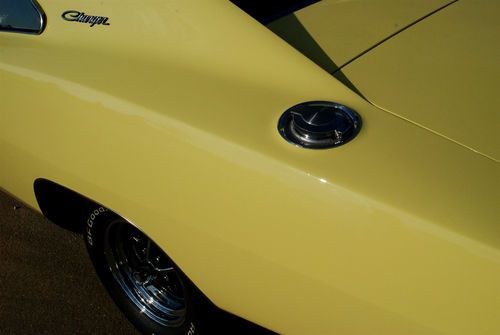 This Charger is an R/T clone car, originally a 318. The car was brought here from New Mexico and sat in a warehouse for many years until I bought it 2 yrs ago. The car had exceptionally little rust, but was hit in a couple places requiring the passenger side quarter to be replaced with a new AMD piece. The left front fender was replaced with an original NOS fender as well as an NOS lower front valence. It also appears to have had some quarter panel work done early on in it's life on the drivers side, probably from a fender bender.
