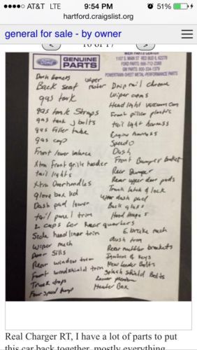 68 Charger RT, I have a lot parts for this car NO engine OR tranny, I spent $4000 in metal alone AMD parts, all NEW FLOOR TRUNK QUARTERS practically a new car when done. I have a detailed list of all parts that I can text you. It has all the windows except the front windshield, this car is hard to find in this condition .