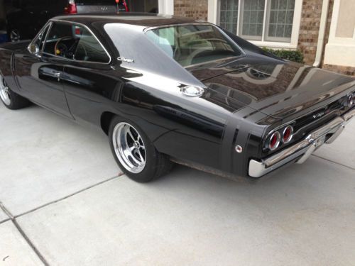 This is a 68 Charger RT tribute, it is not an original RT car. It was originally a red 383 automatic car. It currently has a 440 stroked to 500CI putting out 590HP on pump gas. The engine has had extensive work (crank,pistons,cam,heads). Compression is right at 10.9:1, hydraulic roller lifters, 850 CFM Proform carb with mechanical secondaries. I have installed an MSD ignition with a 2 step (for future trans brake) and billet distributor. The tranny is a race built 727 Manual valve body with a Cheetah shifter. All front bushings are new. The rear end was mini tubbed (professionally done looks excellent), Art Morrison back half with ladder bar setup, 8 3/4 rear end with 391 Suregrip. Front disc brakes (power), bucket seats, new custom upholstery, new window cranks, new mirrors, new LED tail lights, new side markers, new HID headlights (w/ballast), new engine harness, custom front spoiler, working vacuum hide away headlights, new front and rear bumpers, new stock valve covers, new 10MM spark plug wires, new 17" Magnum wheels with new rubber (305 Mickey Thompson's in the rear), new hood blinker lights, aluminum radiator, trans cooler, new air filter, TTI headers, gas tank sump, 3 inch turn down exhaust w/single chamber Flowmaster mufflers, new ignition switch.
