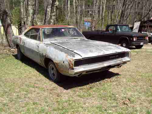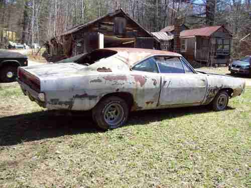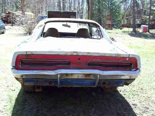I am selling my 1969 Dodge Charger. It has a 1968 nose/ front end on it at this time. It has a 318 v8 motor, automatic transmission and 8 3/4 rearend. The motor is seized and will need rebuilding. I dont know about the tranny as the motor doesn't run. The rearend seems fine, but is not a sure-grip unit. It comes with four vintage slotted rims on it and a spare slotted front rim. It came with factory air conditioning, power steering and power brakes. The power steering box is there as is the booster for the power brakes but the air condition system is not there. The dash and fire wall has the holes for it and pieces of the hoses are still there. I have the rear seat for it but left it out for the pictures, both front and rear seats will need recovering. The rear window was broken when a tree fell on it. I dont have a rear window but I do have another chrome piece for the side of the rear window. I dont have the two little corner piece's for the bottom of the window. I do have all the chrome to go around the windshield. The unibody frame is good but has one bad spot. Its around the rear springs front mount on the passenger side. The rest of the subframe looks ok. The inner fender's under the hood look very good but has the normal rusted out battery box. As with all these old charger's, it will need a few body panels. The trunk, floors and rear quarters are in need of replacing. The nose is 1968 and is in need of work or replacing. This Charger will require a total restoration but AMD is making all the body panel's it needs as well as a new 69 nose/ fenders and hood. I have a clear N.H. title to go with it. These are getting harder to find in any condition and 69's are considered to be the most desirable to some people.
