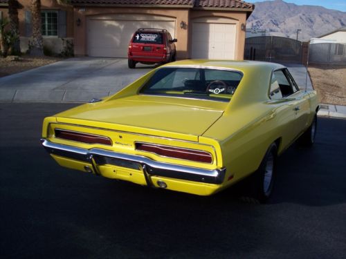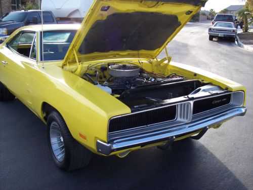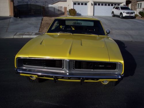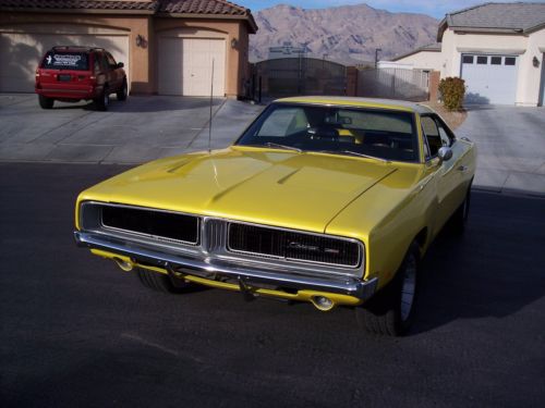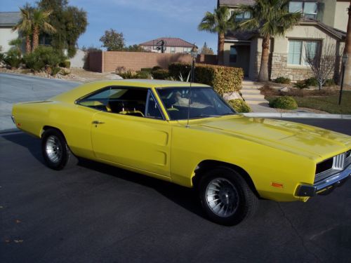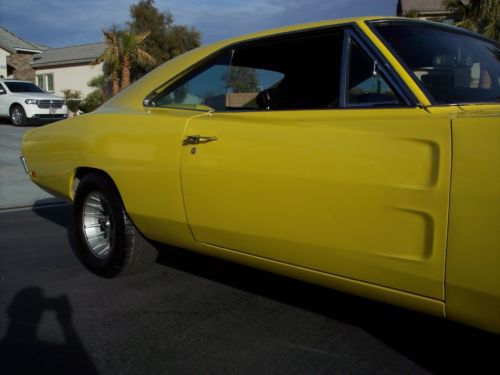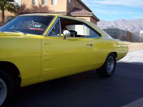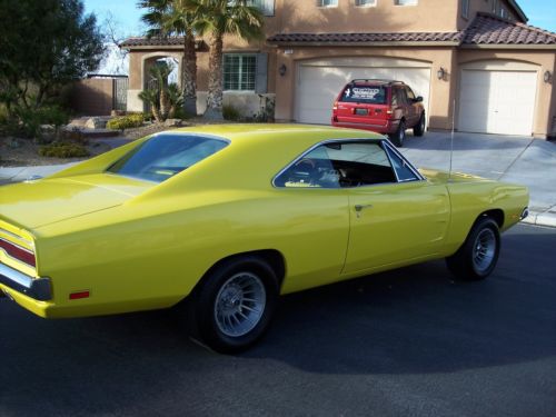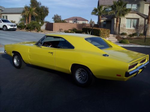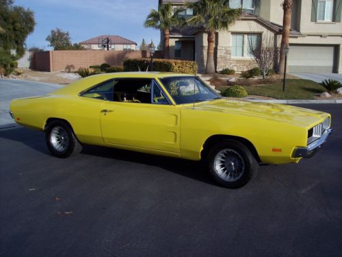 Up for auction is a BEAUTIFUL 1969 Dodge Charger, with a built 440 and a 727 trans. The motor has less than 1500 on her, and same with the trans. The car is wearing a custom paint job, Sunpoppy Yellow with gold pearl. The body is in great condition and no rust issues. The car was completely restored a few years ago, and still looks great. She runs great and will spin the tires with no problem. The engine sports a Steel Crank, 906 heads with hardened valve seats, Purple Cam, and topped off with a 750 Edelbrock. The car has new wiring front to rear, and a custom interior! There is a few small bubbles in the paint near the drivers rear tire, and a few little chips from over the years. Overall the paint is in nice condition. The car has been in many shows, and won a few but, she is not a trailer queen. I have a book full of receipts for the build and tons of pictures from when she was stripped down to bare metal, and completely restored. The car will be sold to the highest bidder, as there is NO RESERVE!! I have clear title in hand for the car. I will listen to all offers to end the auction early but, please do not insult me with low ball offers! Engine/ Trans: The engine is a 1969 HP motor that is .030 over. This is not a numbers matching car! The engine has about 1500 miles on her and she starts right up and runs great. Like I said, steel crank, 906 heads with hardened valve seats, purple cam, Edelbrock intake/ carb, Headers that lead down to dual exhaust. The trans has a shift kit and she shifts nice. The driveshaft is new, and that leads back to a 8 3/4 rear with a Sure Grip and 3:23 gears. The complete drive train is in great condition and very low miles. Interior/ Exterior: The interior is black and yellow, with a new headliner and custom seat covers. The console s in nice shape with no cracks. The dash is in decent shape, no perfect. The windows roll up and down, doors close ok. There are no rips or tears in the seats, and there are new seatbelts in there also. Door panels both look good and match the interior scheme. The exterior sports a older paint job that still shows very well. The body was stripped down to bare metal before she was painted. The trunk looks great and the floors are rock solid also. There are NO RUST issues with the car. It was originally a Texas car. The lights all work fine, and the car has brand new wiring harness throughout from Year One. The car is a PROJECT type car! The winning bidder is required to pay a $1000 non refundable deposit due within 24 hours of winning the car! The car is being sold " As Is" due to it's age. The deposit must be paid through Paypal. The remaining balance is due within 3 days of the auction closing, and the final payment may be made with a Cashiers check, wire transfer or cash in person. The car must be picked up within 2 weeks of the auction closing, and my zip code is 89131 for shipping purposes. Please email me with any questions, and good luck!!