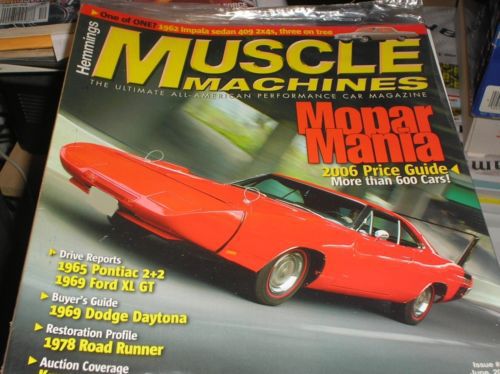 THE “TWIN” R4 RED DAYTONAS. APR 1998 MOPAR MUSCLE RUNS THE “DOCUMENT YOUR MOPAR” ARTICLE AGAIN IN RETROSPECT. OCT 2002 MOPAR ACTION RUNS A FULL COLOR 4 PAGE STORY ON THE DAYTONA ENTITLED “FLYING WING.” THE DAYTONA IS ALSO ON THE COVER OF THE MAGAZINE. JUN 2006 HEMMINGS MUSCLE MACHINES RUNS A FULL COLOR 6 PAGE “BUYER’S GUIDE” ON THE 1969 DODGE CHARGER DAYTONA MODEL CAR USING THE DAYTONA AS THE REFERENCE VEHICLE. THE DAYTONA IS ALSO ON THE COVER OF THE MAGAZINE ISSUE IN A “HIGH SPEED ACTION SHOT” AND IS ALSO REFERENCED IN THE TABLE OF CONTENTS. ASSOCIATE EDITOR DAN STROHL TOOK THE PHOTOS
