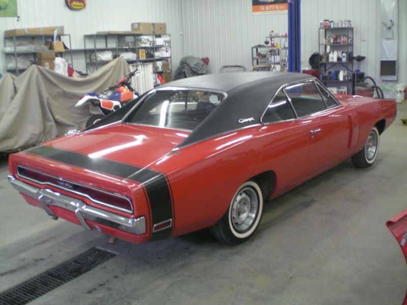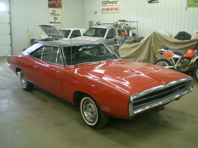 1970 Dodge Charger R/T One owner car for 44 years! This is an ALL numbers matching real '70 Charger R/T 440 Magnum console automatic car. Factory FE5 Rally Red, Black interior, Black top and Black tail stripe, power steering, bucket seats, console, AM radio, rallye wheels and cruise control added in 1972 (paperwork included). Other than one older re-paint from back in the '80's this is an unrestored all original car right on down to the original carpet! Paint looks good but is showing its age in some areas and there is a small amount of rust showing in the lower 1/4's. Frame rails are solid and as well as the trunk floor which is just showing some surface rust on it. The underside is rock solid but it has a coating of dirt/dust from years of the original owner driving on dirt roads. The interior is in overall great shape but does have a couple splits in the drivers seat and the headliner has some wear. As an unrestored car there is some aging and wear but overall this is a very nice original car. The car had been stored inside and was just sitting for the last few years so I replaced the gas tank and sending unit, the gas lines were cleaned and flushed and a new fuel filter added. The carb was opened up and cleaned and the oil and filter were changed. The car starts and runs great! The brakes are a bit soft and the exhaust and tires are older. The car runs and drives good but probably could use some maintenance to be 100% reliable and fully road worthy for long trips. Again, this is an all numbers matching car where all of body numbers match the original engine numbers, the original transmission numbers, the original door VIN sticker, the original VIN tag, the original fender tag and the title. It also has the original carburetor, distributer, radiator, heads, intake, exhaust manifolds, air cleaner and more. Included is the original dealership invoice/bill of sale, the original cancelled checks from when the original owner put $100 down on it and then paid it in full new, the original owners manual, the original warranty paperwork and some older receipts