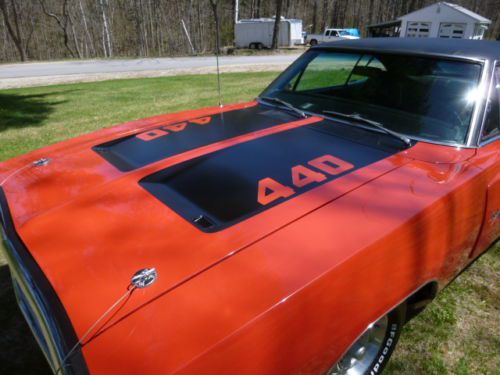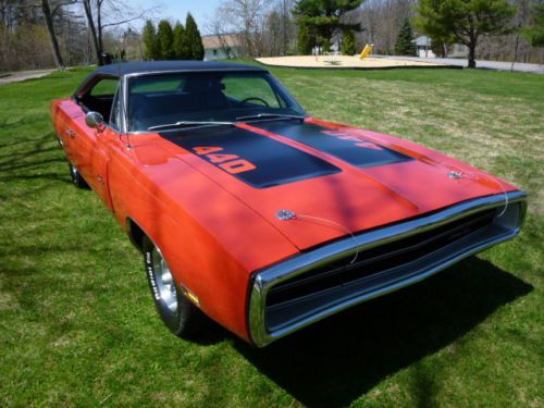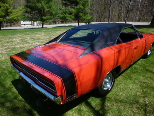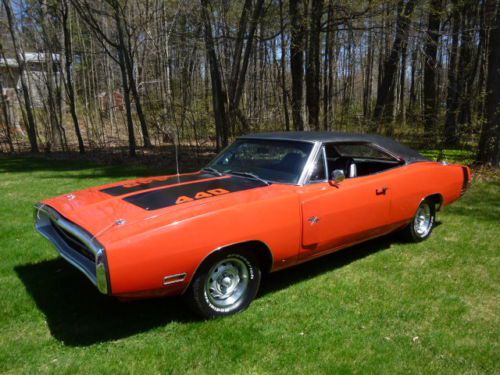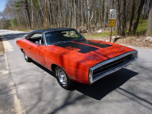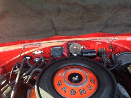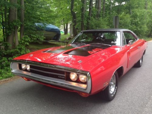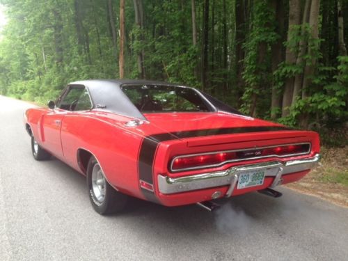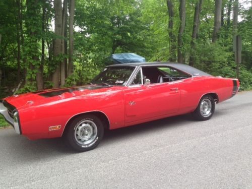 1970 Dodge Charge R/T# matching Engine 440 / # matching 727 Auto/ AC. Factory color code correct (FE5) Med Red, with black vinyl roof (V1X), Car is fender tag correct except for removal of rear luggage rack with black stripe added, and now with upgraded with power windows. Posi 3:91 , Power steering and frt power disc brakes (B51) , front end completely new including steering boxes, functional head away head lights.Longitudinal 440 hood (V68) Performance hood paint (U21) Hood mount turning singnals (L31) Emblems looking real shape. Car just been fine tuned and service and sounds real 440 strong mopar performance, Car has no known defects, except as mentioned charging/service for A/C , Restoration was top quality as can be seen buy the detail work of engine bay, body lines, paint glass and all trim work, Interior correct and shows very nicely and headliner as new during restoration, along with carpets. one frozen in time 440 R/T. All gauges lights wipers all in working order along with interior lights and console, car handle and performs strong.... One item to mention based on Amalie oil change sticker on windshield with date return oil change date (10-2008)/ 59978, and current actual 57083 I would say this R/T only seen 100-150 miles at best over 6 years. As stated Barn fine storage classic R/T. Detail work second to none, A must see for the true Mopar (XS 23 VIN) Charger R/T 440 enthusiasts. Will not respond to text messages only buy E-bay or by phone, Serious buyers only. Contact: 603-583-0024 Shipping quotes available with area ZIP code and state |