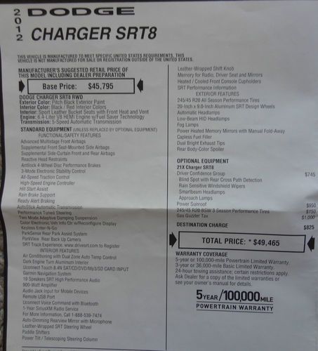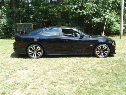 2012 Dodge Charger SRT8, This car is like new, never driven in the winter always kept in a storage facility. Black with red leather heated and cooled seats. Car is fully loaded just look at the window sticker. It has a couple minor scratches on the hood that could be buffed out but I will leave that up to the new owner. One owner non-smoking adult car never abused the car will speak for itself. The car has 7539 on the clock now mostly highway and might have a little more on it over the weekend. If this is the car you are looking for look no further, The Black and red interior makes this a very rare car. Please contact me with any questions. NADA lists the car at 43225.00 retail. Car has always been dealer serviced all record available. Thanks for looking!
