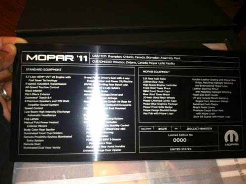This car was won at SEMA and sold to a dealer in Texas. I bought this car from Texas in 2013 and I am the third owner. This car comes with documentation from Mopar stating it's authentication and a brief history of the car. This is number 0000 of 1501 that were made. This car was produced after serialization started for the 1500 hince why its number 0000. I have kept this car stock except for the Mopar CAI. This is a future collector car in my opinion and I look forward to selling this to a great buyer.