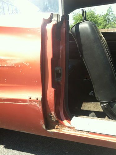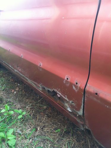 The body overall isn't too bad. Quarters appear to original and the only Bondo I found is on the driver fender which is apparent by looking at it as the paint has worn off. The doors need the most attention as the bottom have rusted out. The gaps look good and the doors open and close. Driver window crank is jamb, probably due to rust in the mechanism so it doesn't go up and down. All glass is there and is good. There are various areas of rust and dents on the body here and there, but nothing I consider major. Other than the trim on the side of the car, everything thing is there and the car is complete.
