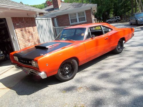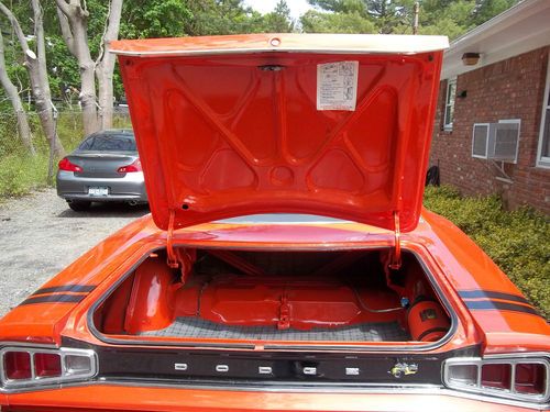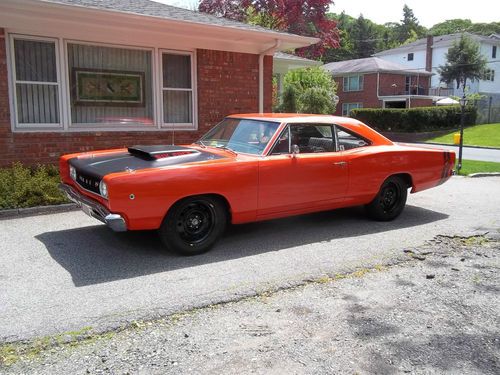 1968 WAS THE FIRST YEAR FOR THE SUPER BEE, AND THIS IS A REAL WM21 SUPER BEE. HEMI ORANGE WITH A BLACK BENCH SEAT INTERIOR. SHINY PAINT AND CHROME. VERY CLEAN INTERIOR WITH SOME SPLIT SEAMS IN DRIVERS SEAT UNDER DRIVERS BUTT. NON MATCHING NUMBER 1970 HIGH PERFORMANCE 440, EDELBROCK ALUMINUM HEADS AND TORKER II INTAKE, PRO FORM 950 CARB WITH NITROUS. MSD PRO BILLET DISTRIBUTOR. LUMPY CAM. HEADERS WITH A FULL EXHAUST WITH FLOWMASTER MUFFLERS AND CHROME TIPS, AS WELL AS EXHAUST CUTOFF DUMPS. FRAME CONNECTORS. 727 TRANSMISSION WITH STALL CONVERTER, CHEETAH SCS SHIFTER AND TRANS COOLER. 410 POSI REAR, FRONT DISC BRAKES. 215/65R17 GOODYEAR RADIALS WITH MOPAR BLACK STEEL WHEELS. FIBERGLASS LIFT OFF HOOD. AUTO METER GAUGES AND SPORT COMP RACING TACH WITH SHIFT LIGHT. UNDER DASH KENWOOD STEREO CD PLAYER WITH REMOTE CONTROL. NICELY DETAILED IN DOOR JAMBS AND TRUNK AND UNDER HOOD. SOLID, RELIABLE AND VERY FAST ROCKET SHIP THAT PULLS LIKE A MONSTER. THIS CAR HAS PLENTY OF EYE APPEAL, AND HAS A NASTY SOUNDING RUMBLE. THIS IS A TRUE 60's MUSCLE CAR AT A VERY AFFORDABLE PRICE.