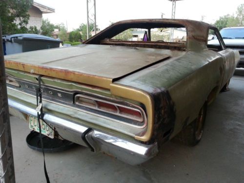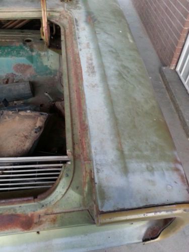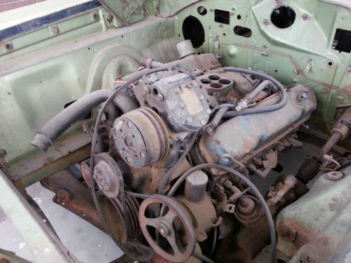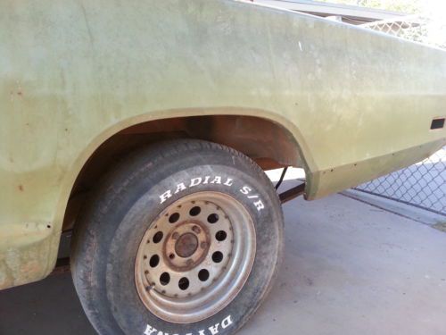 Great candidate for Super bee clone. No title or fender tag :( Comes with 1970 dated 383 motor with A/C and 833 4 speed transmission, 4 speed pedals, complete center hump, and partial center console. Original 318 automatic; High Impact F6 green; A/C Dash, with Front Disc Brakes. has tinted quarter window glass. Needs some floor and center trunk work (above gas tank) side trunk is beautiful, but overall very solid for a mopar. Car was originally undercoated. Rock solid frame rails, engine compartment, doors, hood and deck lip. Very good quarters; some minor dents; no rust on wheel wells ever. Front fenders solid, but a few minor dents, savable. Both front and rear bumpers great shape. Car is a total restoration project. Interior was taken out for media blasting. Have all trim, moldings and rear glass. Mostly complete. Needs: gas tank, front seats, radiator, carb, drivers side HP exhaust manifold, driver door glass, front glass. On Aug-16-14 at 17:51:39 PDT, seller added the following information: |