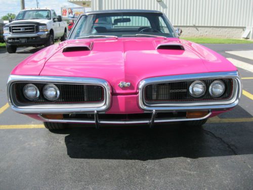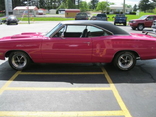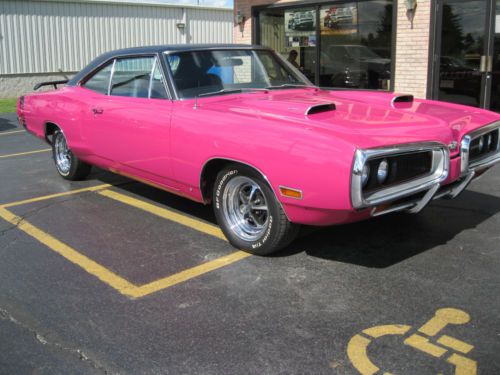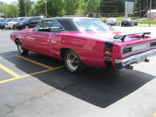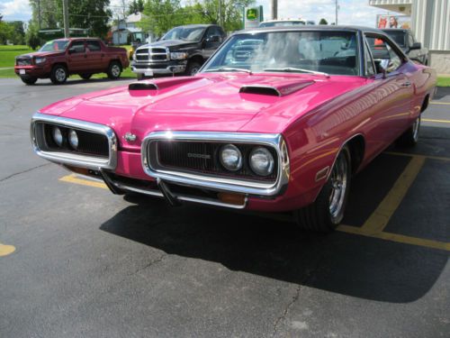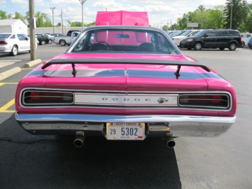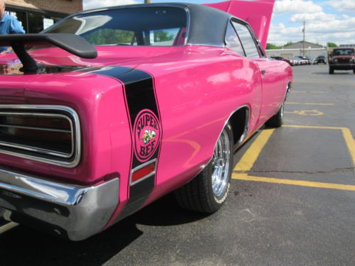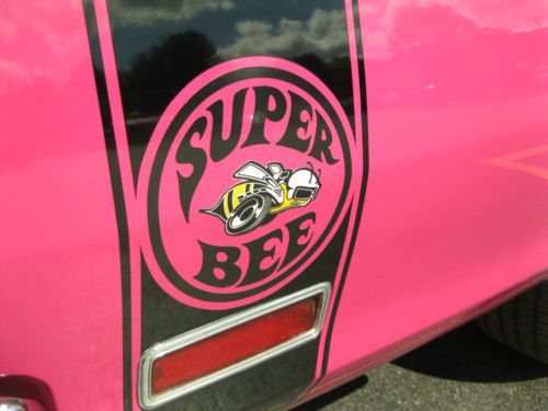 1970 DODGE SUPER BEE TRIBUTE PANTHER PINK DODGE CORONET THAT HAS BEEN TRANSFORMED IN TO A GORGEOUS SUPER BEE TRIBUTE!! 4SPEED,440 SIX PAK,BLACK VINYL TOP,NEW MOPAR 500 MAGS,NEW TIRES,MOTOR RECENTLY REBUILT,BLACK VINYL INTERIOR,ONE REPAINT IN FACTORY ORIGINAL COLOR, DOOR JAMS,TRUNK JAM,UNDER HOOD MOSTLY ORIGINAL PAINT,CAR RUNS,DRIVES EXCELLENT,NEW ALUMINUM RADIATOR,CHROME SHROUD,NEW DUAL EXHAUST, THIS IS A RARE COLOR!!! SAVE THOUSANDS OFF A REAL SUPER BEE!!! ONLY YOU WILL KNOW!!! GREAT CAR,LOTS OF EYEBALL,DRIVE ANYWHERE!!!! WOW!!! |