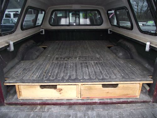 Bed has custom made storage shelf and a cap,ladder rack on top.
