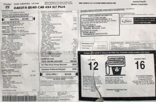 2000 Dodge Dakota SLT Crew Cab Pickup 4-Door 5.9L LOADED! BEAUTIFUL! see Photos and ORIGINAL WINDOW STICKER OPTIONS LIST ! NUF SAID THIS BABY SELLS ITSELF!!! |