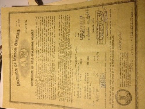 The original owner, Mrs. Helen Booker, purchased this car on Friday, November 22nd, 1963. That was also the the day that JFK was shot. Because the original Virginia title has that date on it, the VA DMV considered the original title a historic document, and let it transfer with the car. It is included in the sale.