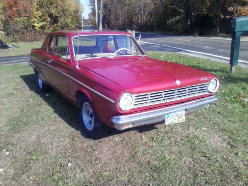 1965 dodge dart. this car has a 273 v8 has bigger cam aluminum intake new edelbrock carb. the car has hooker headers and dual exhaust.rebuilt transmission with 2500 stahl convertor. new shocks all the way around. newer tires. the interior is in very nice condition, this car came out of mexico and is very solid you wont be disappointed. this is a easy project for someone it just needs a nice paint job. chrome is in decent shape. this is a very fun little car. the car is for sale locally as well.the odometer shows 13828 not sure if the mileage is actual or not I can look more into it any questions call bob at 44033993