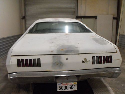 Up for sale is a 1971 Dodge Demon California original 95% rust free project. Only rust is a few holes in bottom of spare tire well in trunk and a couple of pinholes on lower rear section of the right quarter panel. Rest of the car is 100% rust free California preserved! Has some dents here and there but overall a very straight original Demon still has the original white paint and original Demon stickers intact car has never been repainted in 43 years!!! Original C code slant six car is completely numbers matching engine currently runs but transmission is not functioning currently(maybe just plugged filter or a little low on fluid) or needs a rebuild. No front seat included was missing when I purchased the car was originally a bench seat. Car has a clear California title on a current non-op so no back registration fees!. Call Dean at (530)953-6092 for more information