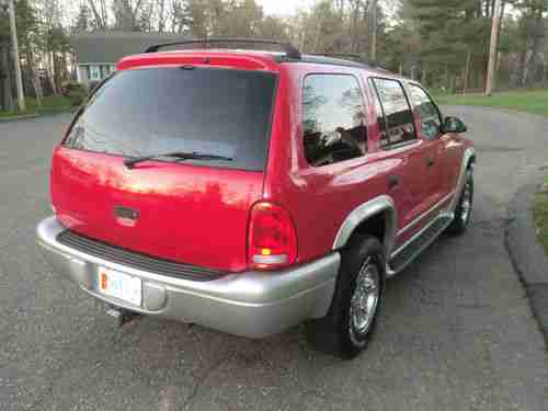 UP FOR SALE IS A BEAUTIFUL 2002 DODGE DURANGO SLT LOADED WITH LOW MILES BUY IT NOW $5995.00. THIS SUV IS VERY CLEAN THE EXTERIOR OF THIS SUV IS VERY CLEAN NO MAJOR DENTS OR DINGS THE PAINT IS VERY SHINY THIS IS A SHARP COLOR COMBO IN THIS TRUCK. THE INTERIOR IS LIKE NEW CONDITION THE LEATHER INTERIOR IS PERFECT NO RIPS OR MAJOR WEAR THE HEATED SEATS WORK GREAT THIS VEHICLE HAS POWER WINDOWS POWER LOCKS AFTERMARKET CD PLAYER (SOUNDS REALLY GOOD) THIS DODGE DURANGO DOES HAVE THE 3RD ROW SEAT. WE JUST HAD THE TRUCK COMPLETELY SERVICED BRAND NEW EXHAUST OIL CHANGE THE FRONT END HAD NEW BALL JOINTS INSTALLED, THE TRUCK RUNS AND SHIFTS LIKE NEW. THERE IS ALSO A K&N AIR FILTER INSTALLED UNDER THE HOOD. THIS IS A GREAT TRUCK FOR THE MONEY THIS IS THE BEST PRICE AND THE MOST SHARP LOOKING DODGE DURANGO ON EBAY!! BUY IT NOW $5995.00 ANY QUESTIONS PLEASE CALL ME DIRECT AT 413-244-4779 ASK FOR RICH. PLEASE LOOK AT ALL THE GREAT PICTURES OF THIS 2002 DODGE DURANGO SLT. THIS VEHICLE IS BEING SOLD AS IS WITH NO WARRANTY. AS ALWAYS THANKS FOR LOOKING!!