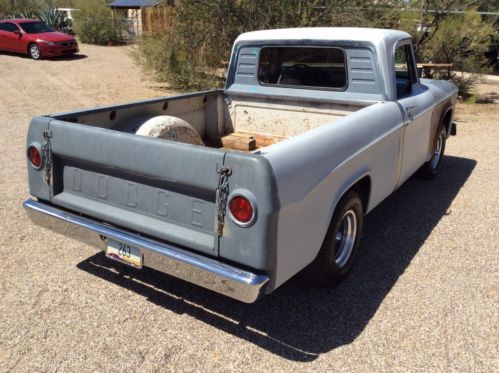 Up for sale is this beautiful 1966 Dodge D-100 Short Wide Bed pickup truck with a clean and clear Arizona title. Engine is a 5.2 Liter, 318 CI poly two barrel, with 133,000 miles. A 4 speed transmission, makes this truck a great cruiser/daily driver in the city or freeway roads. Motor and transmission have been professionally rebuilt 8500 miles ago. New 4-Core radiator, hoses, fluids changed, brakes, clutch cylinder, wheel cylinders, belt and distributor cap all have recently been replaced. Some features of this truck are, Cragar Torque Truster rims w/65% tread on the tires, custom exhaust, optima battery, newer interior and much more make this truck stand out from the norm. No body side moulding, but all other trim will go with truck. All lights, gauges etc work. Great solid rust free truck (except a few spots on the tailgate). Just a good reliable daily driver, shop truck and just needs finish body work and your choice of paint! Low reserve, please don't ask for reserve as it is not fair to other bidders. VIDEO 1966 Dodge D100 SWB Start up and Walkaround: http://youtu.be/Vv3FCMloqyo
