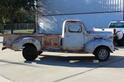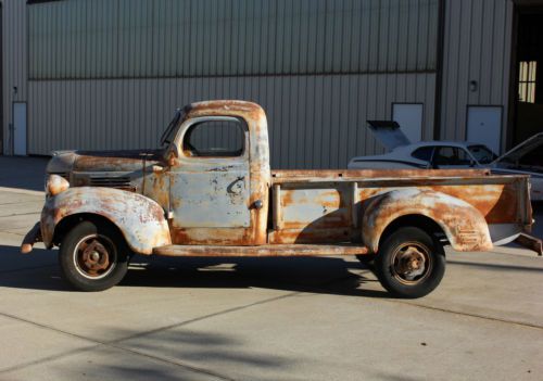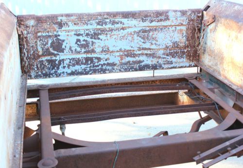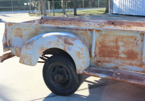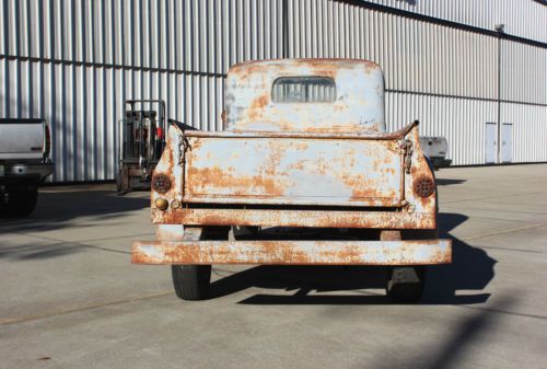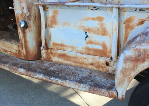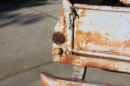 As you can see from the pictures, the truck is solid, solid, solid. Found out in dry Nebraska without a title. The door jam Serial Tag is missing but replacements are available. Vehicle's Serial # was found on the frame facing the left front wheel, right where it is supposed to be found. Engine was not stuck and it didn't take much to get it to start. It sounds good. Transmission was frozen, so we removed it, took it apart and it is ready for a rebuild kit. Rust is specifically limited to two places that are truthfully easy areas to fix. 1) in the overhead panel cover in the cab (wiper motor cover area) Mice nest/urine created the rust. 2) small lip area of the bed floor right behind the driver (~6 x 2.5 inches). See pics of both areas. Have the seat springs bottom and back and they are in good condition for new padding and then to recover. Glass is all there, front driver's side is cracked but it is a flat piece and easy to have made. Headlights, cool side marker lights, rear reflectors and light all there and in good shape to be left alone. Appears the front bumper was bent upward when someone tried to lift it with a forklift at some point. This is a project truck where everything will need to be gone through... but what an incredible starting condition! See my other listings and ask about my other dry sheet metal western state field finds, barn finds, old race cars, forgotten projects, hemi engines, etc. etc. etc. Questions? |