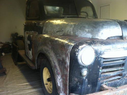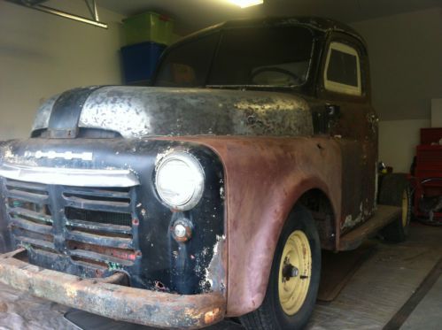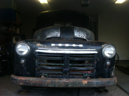 I purchased this truck about a year ago with the intent of restoring it. Unfortunately I have not been able to spend the necessary time required to get it back to a drivable condition, and with an upcoming deployment I need to sell it. This 1949 Dodge Pilot House Pickup is a good parts truck, or candidate for restoration or rat rod. It has a solid frame and comes complete with the original inline 6 cylinder flat head engine and four speed transmission. The engine was last started over a year ago when I drove it into my garage in order to begin the rebuild. There is the usual amount of rust on the grill (with some rust through the lower front right corner), front and rear fenders, and lower edges of the doors. The floor pans are rusted through and will need replaced, as well as the gas tank. The bed sides have some surface rust and the front bed panel has rusted through the lower edge of the panel. The tailgate is not the original tailgate.