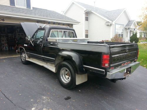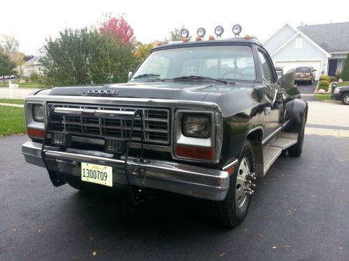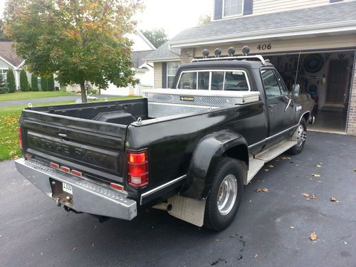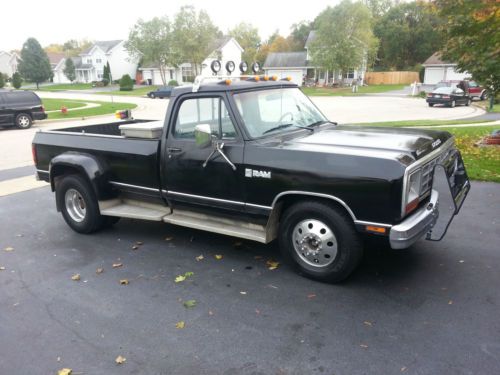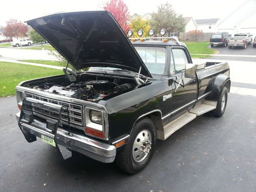 1983 Dodge D350 Custom single cab dually. 360/auto, air, cruise, tilt. Showing 81K miles. Alcoa rims. KC light bar and Owen bumper guard w/fog lights. 5 Star bedliner with Husky tool box. Truck was originally white, a previous owner painted it black. Truck currently has a start button,no ignition key, no turn signals. No door keys either. Would make a great Cummins conversion.