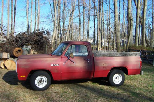 Nice little 318 2 wheel-drive automatic Dodge D150......faded red paint and very little rust, which is present mildly in the wheel arches of the bed. Never hit and barely a dent in it. Glass is all good. Runs and drives great. No smoke ....shifts nice. I have 2 front bumpers in good shape and their brackets that are included with the auction. For sale locally here in Shrewsbury, New Jersey.......It is registered and insured so, we can take it for a drive.......Call Steve at 732-530-2061........