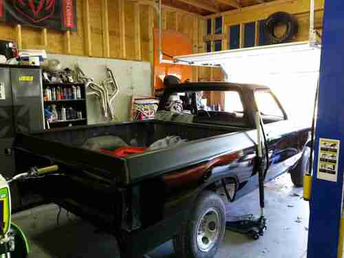 i have a 1989 dodge ram for sale. all of the body work is done. The truck is painted satin black on top and gloss black on the bottom, there is a green stripe divding the two colors.the truck has a 318 auto. runs fine transmission works fine as well. Thottle cable is broken but it still runs. needs front end work, ball joints, tie rods the usual stuff. have all the glass to put back together except windsheild. there are a few custom touches, such as shaved stake pockets marker lights and shaved gas door. i was going to put a fuel cell under the truck where the spare tire was located then fill it through the bed. have all the exterior pieces grille tailights headlights an the bezels. No front or rear bumpers. All interior need work. wheels and tires are just rollers not really any good for anything else. frame is in great shape no rot or rust.the cab of the truck is in great shape. the floors sre soild as well. Would consider parting out, let me know what you need. we can see if we can work something out. truck is for sale locally. buyer responible for shipping of truck and or parts. my reserve is 1,300.00. thanks for looking an happy bidding. i can send more pics via txt message if u would like.
