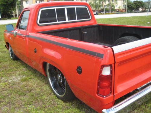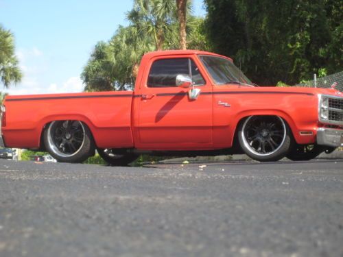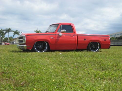 No Reserve,No Gimmicks or Games High Bidder wins this great truck !!!! Thanks for checking out our listing on this Bad ASS Bagged Dodge D150 Custom pickup.You see lots of Chevy"s,and Fords Bagged but this Dodge looks insane and everyone loves it.This is a running driving project truck with most of the hard work already done.The truck itself is in excellent condition and shows amazing it commands attention everywhere it goes.The exterior and paint are in excellent shape with a few blemishes please look at the last two pics for the noticeable blemishes.The interior is in excellent shape nice seat seat and door panels with the roof and door inserts color coded to match the truck.The truck itself is basically stock and runs and drives well it has a 318 Engine all stock with a Holley 2 bbl carb that runs great and quiet with no leaks matched to a 3 speed automatic transmission that shifts fine.The truck is in great shape and mostly everything mechanical works besides the windshield wipers,hazzords and dome light.The factory gauges all work,the headlights,tail lights,brake lights,horn and radio all work.The glass is all in excellent shape and the keys lock and unlock the doors and it uses the factory ignition switch.The truck has a new alternator,starter relay,front air bags and voltage regulator.The truck has 22" Lorenzo rims with Falken tires with excellent tread. As far as the air ride the Rear is a custom 3 link with the air bags mounted behind the axle and shocks for a smoother ride.The truck has Firestone bags on all four corners with 4 valves an Air Zenith compressor and a polished 5 gallon tank.The bag system is real simple with one switch for the front and one for the rear with a gauge to show the air pressure.Like i said this is an amazing running driving project with most of the hard work done what it needs is some attention to mounting some of the hardware in the rear,the c noth boxed for support and just some finishing touches on the bed and tubs but it runs and drives the way it is and is driven on a regular basis and very reliable.We do have the original inner fender wells and tubs for the rear that we will include with the truck.The truck has dual gas tanks but the stock plastic standard tank is cracked and we drive the truck off the auxillary tank only which is a 15 gallon tank.The truck is sold as is but please take time to read our feedback and bid with confidence,these pictures where all just taken and we have driven the truck on a regular basis to be able describe it accurately.Florida residents must pay 6% sales tax and tag or transfer,no dealer fees.Transportation is the responsibility of the fortunate new owner we will assist any way we can with storing and loading.Please feel free to email me with any questions or offers,thanks for looking and Good Luck!!