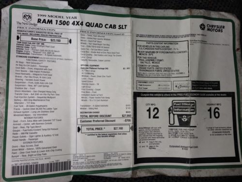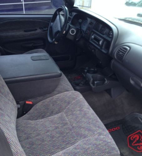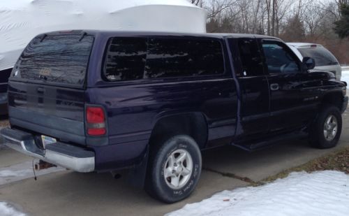 Up for sale is a 1999 Dodge Ram 1500 Quad Cab with 4x4 capabilities and a SLT package. This is in good condition. There is starting to show signs of rust on the rear quarter panels and underneath the doors. There is a cd stuck in the radio so that will need to be replaced and the radio antenna broke off so the reception is pretty sucky but that can be fixed easily I just never had the time. Also the driver headlight is cracked open but it still works properly. Other then that there is no other major sign of wear or issue. There are tons of features on this truck. A few are cruse control, heated mirrors, power mirrors, air conditioning, ect. The rest can be seen in the photos as I have the original window sticker. The truck color is Deep Amethyst Pearl Coat, as far as I know there was only 1,500 made that year. The interior is agate and is in perfect condition. There is an aftermarket subwoofer and new speakers that give a good kick. Also, there are aftermarket black metallic racing stripes added over the length of the truck. The truck has been sitting for a while and the battery is dead, but I will replace that with a recommended battery.