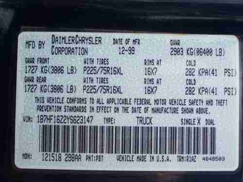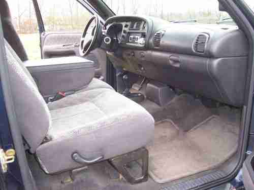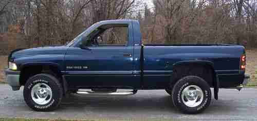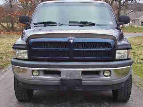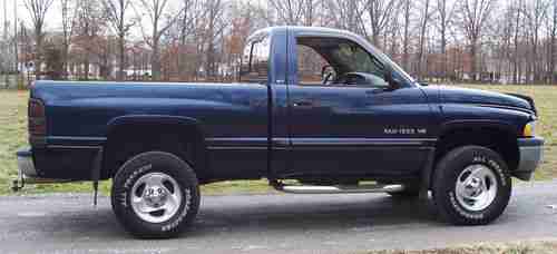 2000 Dodge RAM 1500 Laramie SLT 4x4 standard cab, short bed. Patriot blue pearlcoat w/ grey cloth interior, 5.9L V-8 Magnum automatic, tilt, cruise, A/C, power windows/locks/mirrors, SONY CD stereo, tach, overhead console w/temp/compass/MPG readings, rear sliding glass, aluminum rims, chrome step rails, fog lamps. 85,318 miles. Sharp truck; very clean. Runs & drives GOOD.