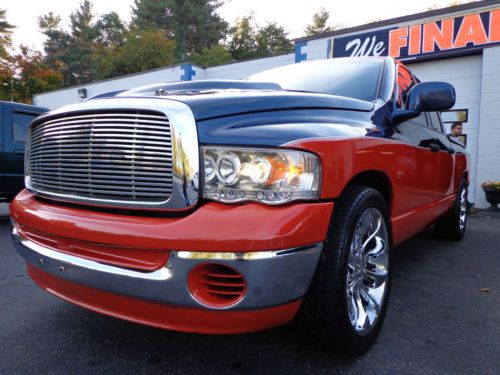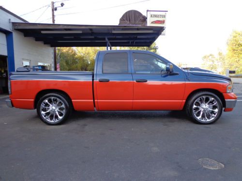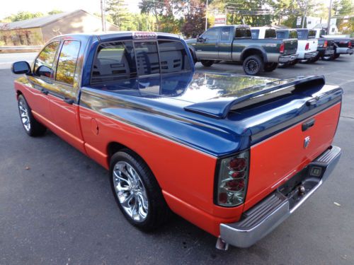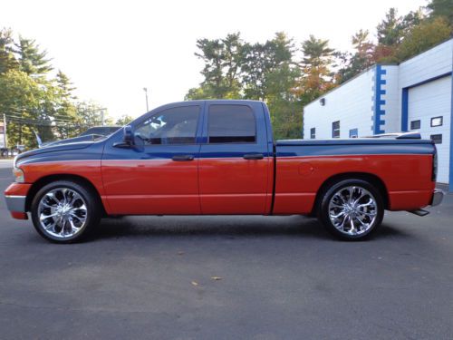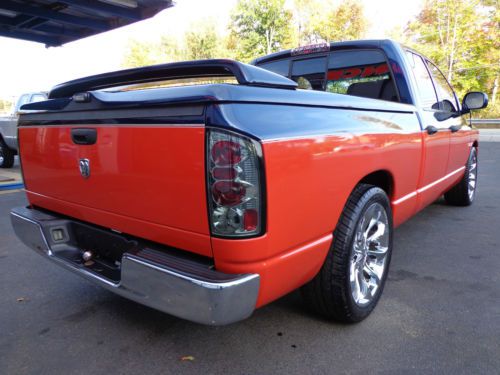 2005 DODGE RAM 1500 SLT CREW CAB. AUTOMATIC TRANSMISSION WITH A 4.7L V8 ENGINE, SLT MODEL WITH ALL FACTORY POWER OPTIONS, KENWOOD CD PLAYER WITH IPOD HOOKUP AND KEYLESS ENTRY. THIS TRUCK COMES EQUIPPED WITH MANY AFTERMARKET UPGRADES SUCH AS 22" 'JOE MARTIN VAMPIRE 2' RIMS WITH 4 LIKE NEW 305-40-22 'TOYO PROXES' TIRES, CUSTOM TWO-TONE BLUE AND ORANGE PAINT, FIBERGLASS COWL INDUCTION HOOD, AFTERMARKET GRILL, AFTERMARKET HEADLIGHTS AND TAIL LIGHTS, CUSTOM EXHAUST, HARD TONNEAU BED COVER, POWER SLIDING REAR WINDOW, KEYLESS ENTRY WITH ALARM AND CUSTOM AIR BRUSHED INTERIOR PANELS.