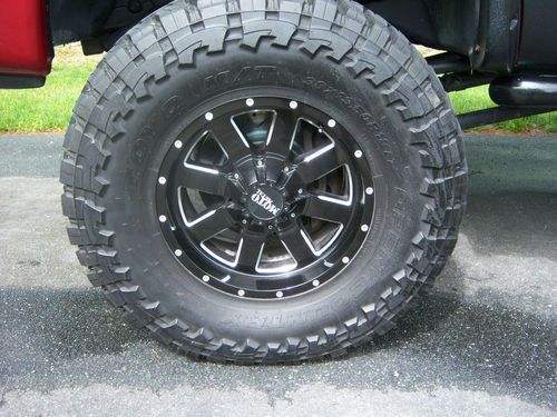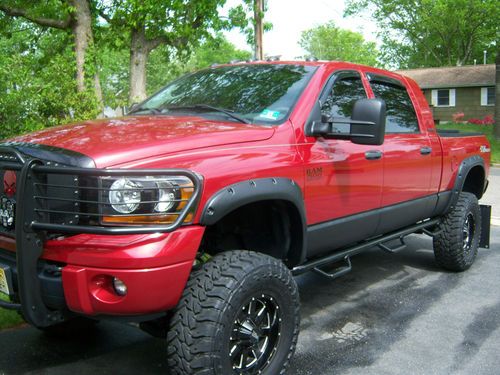 Truck has been lifted 8 inches and sits on 38 inch toyo mt tires with 18 inch moto metal wheels. Has the pro comp long arm kit, Transfer case clocking kit for better drive angle, newer front drive shaft, new ball joints, new brakes all the way around, New psc steering box with bigger sector shaft, steering brace, new steering conversion from pure performance, dual bilstein stabilizers, newer hub bearings, 4.56 gear ratio front and back with lucas oil. Rear has air lift air bags, 3 step bars, grille guard with piaa lights, custom grille with punisher logo painted to match truck, electric fans, cold air intake with throttle spacer, diablosport tuner, custom heated tow mirrors, led tail lights, step hitch. Custom mud flaps for rear tires, Gibson extreme dual exhaust. Black dodge ram headlights