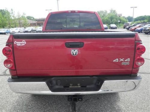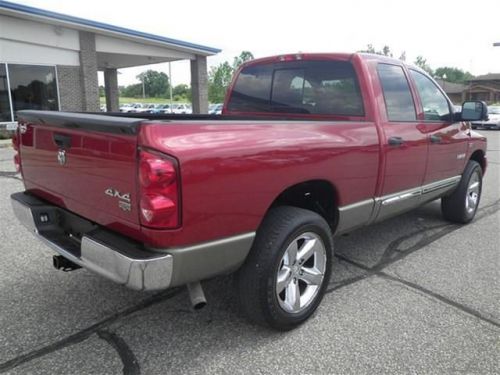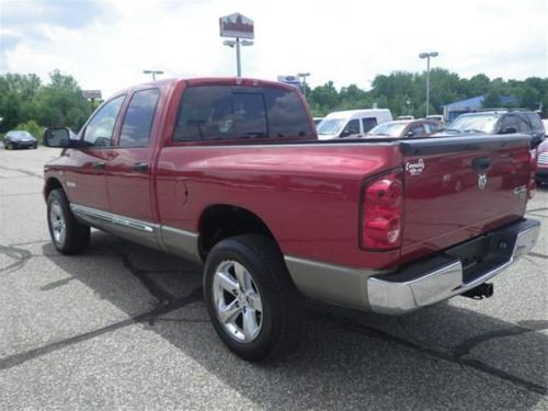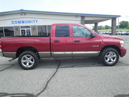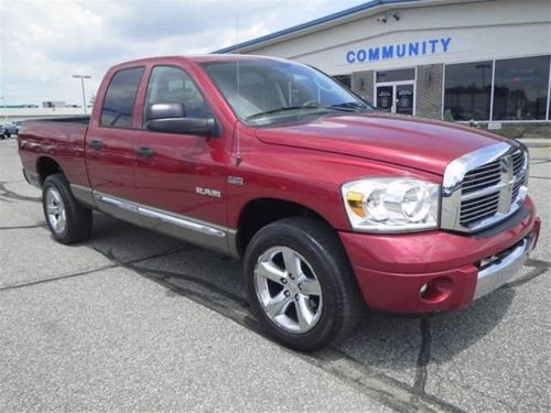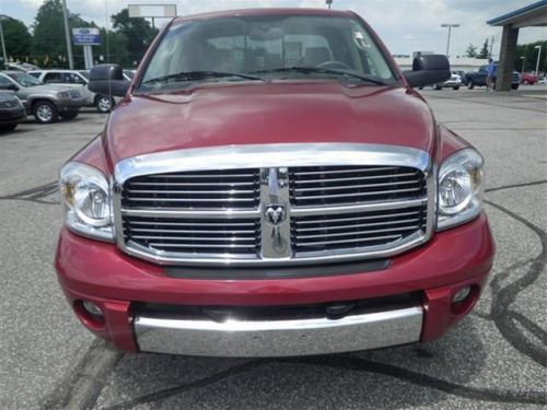 1 owner zero accident clean carfax! Fully loaded! Laramie! Hemi! Non smoker! 2008 Ram 1500 Quad Cab four wheel drive Laramie. Red exterior with a gold lower break, tan leather interior with wood trim. 5.9L V8 with automatic transmission and electronic 4wd. 20' chrome wheels, fog lamps, tow hooks, tow package, tow mirrors, spray in liner, keyless entry and alarm. Infinity Audio System with stereo controls on the steering wheel, power drivers seat, heated seats, power rear sliding window, power adjustable foot pedals, CD player and overhead information center with compass and tempurature!