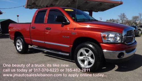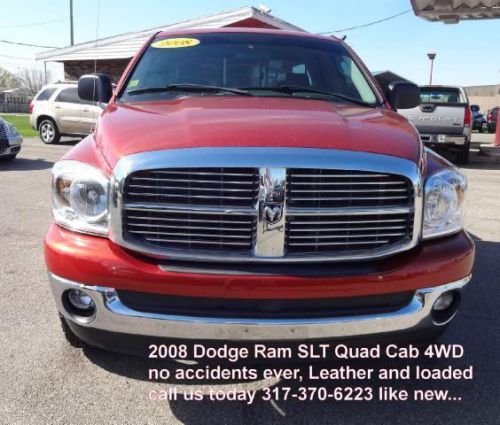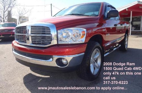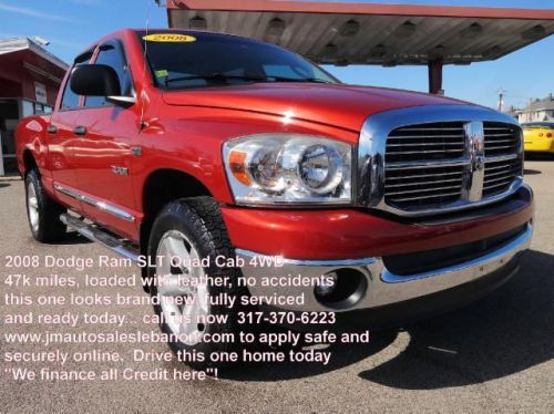 This 2008 Dodge Ram SLT Quad Cab 4WD is a big horn edition with 5.7 Hemi Power, all power, leather seating, this one looks brand new, like its never been set in, its truly that nice. We accept any and all trades, just drive it in. We provide you a nationwide warranty with a zero deductible that comes free with our vehicle, it cost you nothing for this plan and its good anywhere you live, you take it where you want for any covered repair, and that repair will cost you nothing. Towing and rental car allowance comes with this plan. We accept cash, cashiers check, all major credit cards, bank drafts or wires or finance this with one of our many lenders that we offer. We have over 35 lenders here such as banks, credit unions, finance company's and our own in house lending programs for those with credit issues such as tax liens, bankruptcy, divorce, repossessions, the self employed, social security or disability incomes, no credit, slow credit, we cover just about all the bases, call us or apply online, you'll find our website on almost any of these pictures, why wait, drive this one home today.. Visit our website at www.jmautosaleslebanon.com for more pictures or give us a call at 877-730-3227, ask for Jerry! Why Buy from us! Our dealership, has a smaller more personal, very honest, family way of doing business. We can offer you a better value for the dollar because of our low overhead, so you get more vehicle for less money at J&M Auto Sales Inc of Lebanon. All our vehicles go thru an inspection process and are repaired and certified ready before you even look at the vehicle. Our fee's are of course Indiana Sales Tax, BMV Fee's and our Doc Fee. We also offer to you warranty's that comes along with the vehiclie thru our pricing. You pay nothing extra! Our Owner has been in the car industry over 25 years and has exceptionl knowledge of where to find almost any brand that you desire, so come see us and see just how the Small town dealership can give you more *IMPORTANT NOTICES* SEE VIDEOS OF OUR VEHILCES AT www.jmautosaleslebanon.com FREE 6 MONTH OR 6,000 Mile Warranty. Vehicles pass a 75 point inspection before offered for sale. All Vehicles are certified and come with a free warranty and free carfax history report. Prices do not include doc fee, registration, or state sales tax. We have financing, banks, credit unions, ect, for almost anyone!