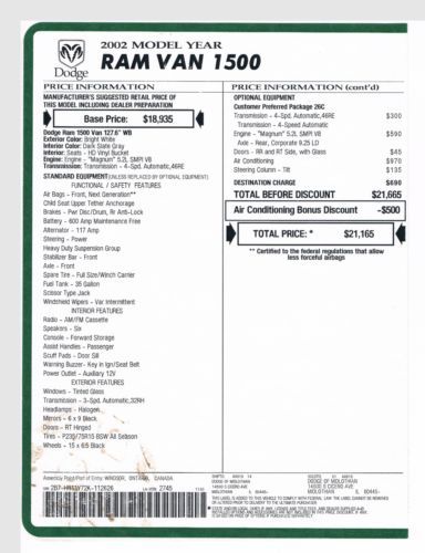 Ram 1500 Van V8 5.2l Magnum Smpi 4-spd Automatic 127.6" Wb on 2040-cars
