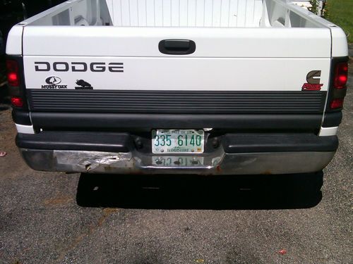 PLEASE READ ALL BEFORE YOU BID!!!UP FOR BID IS A 1996 DODGE RAM 2500 2 WHEEL DRIVE (2WD)WITH THE 5.9 12 VALVE CUMMINS TURBO DIESEL GVWR 8800LBS . TRUCK HAS 108,900 MILES ON IT. TRUCK IS STOCK, 8 FT BED RUNS GREAT HAS POWER WIDOWS CRUISE CASSETTE AM/FM REAR SLIDER LARGE STORAGE ARM REST PRETTY CLEAN INTERRIOR HAS SOME MINOR STAINS ON FLOOR SEATS AND DASH ARE CLEAN DASH HAS ACOUPLE VERY MINOR CRACKS.ITS HAS TWO FITH WHEEL BRACKETS IN BED BRACKETS ONLY. EXTERIOR NEEDS PAINT TOUCH UP AND HAS COUPLE VERY EASY RUST SPOTS IN PHOTOS. THE FRAME HAS A SPOT THAT NEEDS A VERY EASY SMALL PATCH ABOUT 8"IN PHOTOSMOST SPOTS ON BED A COUPLE VERY SMALL IN THE BED. DONT LET THAT SCARE YOU ITS REALLY A PRETTY MINOR REPAIR, IF YOUR HANDY YOU CAN DO IT YOUR SELF. TRUCK HAS NEW ALTINATOR TWO NEW BATTERIES AND NEW FUEL PUMP AND NEW FUEL LINES/FILTER ($900).TIRES ARE 80% TREAD LIFE LEFT.IT HAS CURRENT STICKER BUT WILL NEED THE RUST REPAIRED. COULD USE A NEW REAR BUMPER AND A ALIGHNMENT.TRUCK SHIFTS GOOD AND RUNS GOOD OTHER THAN THE FEW RUST SPOTS THIS IS A REALLY GOOD CUMMINS WITH LOW MILES.PLEASE DO NOT BID UNLESS YOU HAVE THE MONEY TO BUY THIS TRUCK I AM NOT A DEALER AND THE TRUCK IS ASIS AS I CAN NOT GIVE A WARRANTY. BUYER IS RESPONSABLE FOR ALL PICK UP/SHIPPING ARANGMENTS. $500 DEPOSIT NON REFUNDABLE THROUGHT PAYPAL ONLY!!!(KEEPS THE TIRE KICKERS AWAY SORRY) ,WITHIN 24 HOURS AFTER AUCTION ENDS!!!!! NO EXCEPTIONS!! THE REST OF THE PAYMENT NEEDS TO BE MADE WITHIN 7 DAYS CERTIFIED BANK CHECK ONLY!!! TRUCK WILL NOT MOVE UNTIL PAYMENT IS CLEARED!!!AND TRUCK NEEDS TO BE PICKED UP WITHIN 30 DAYS AFTER PAYMENT IS MADE IN FULL!!! THIS TRUCK WILL BE DRIVEN UNTIL SOLD SO MILAGE WILL BE SLIGHTLY DIFFERNT THAT STATED NOTTHING CRAZY.IM SELLING THIS TRUCK SO I CAN BUY MY FIRST PEICE OF LAND. IF YOU HAVE ANY QUESTIONS PLEASE ASK BEFORE YOU BID! IF YOU BID AND YOU WIN YOU OWN THE TRUCK AND WILL BE RESPONSABLE FOR PAYING 100% OF THE SELLING PRICE.